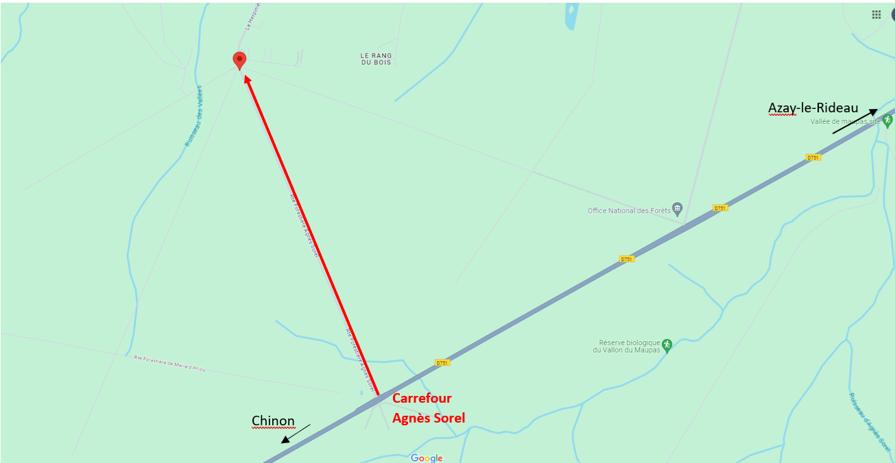 RDV à 14h00 au carrefour au sud du lieu-dit La Herpinière à Cheillé (voir image ci-dessous), accès par la D751 en venant d'Azay-le-Rideau direction Chinon, puis prendre à droite au carrefour Agnès Sorel (5 km après Azay), le point de RDV est à 1300 m. Coordonnées GPS : 47°14'47.5"N 0°24'18.2"E